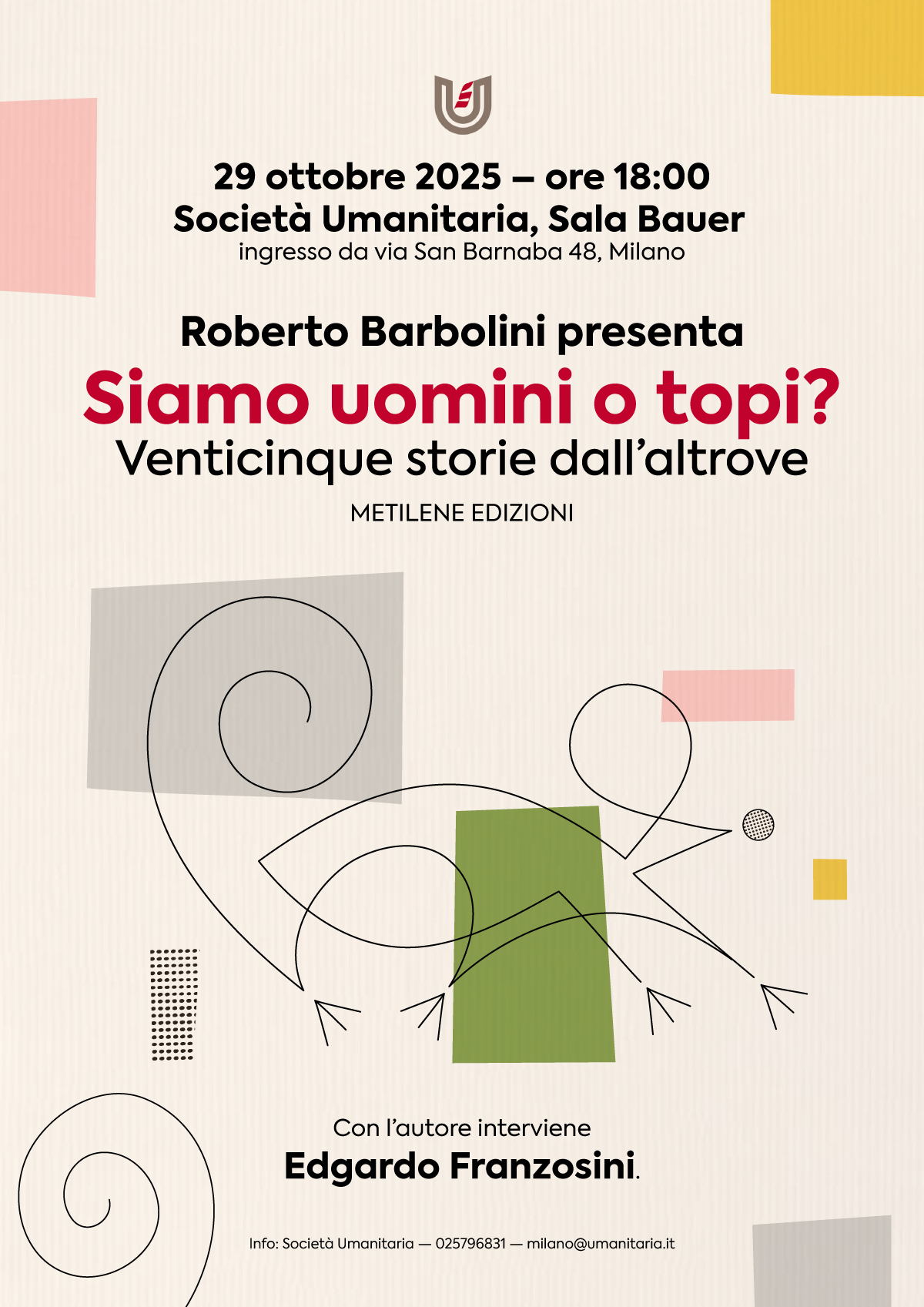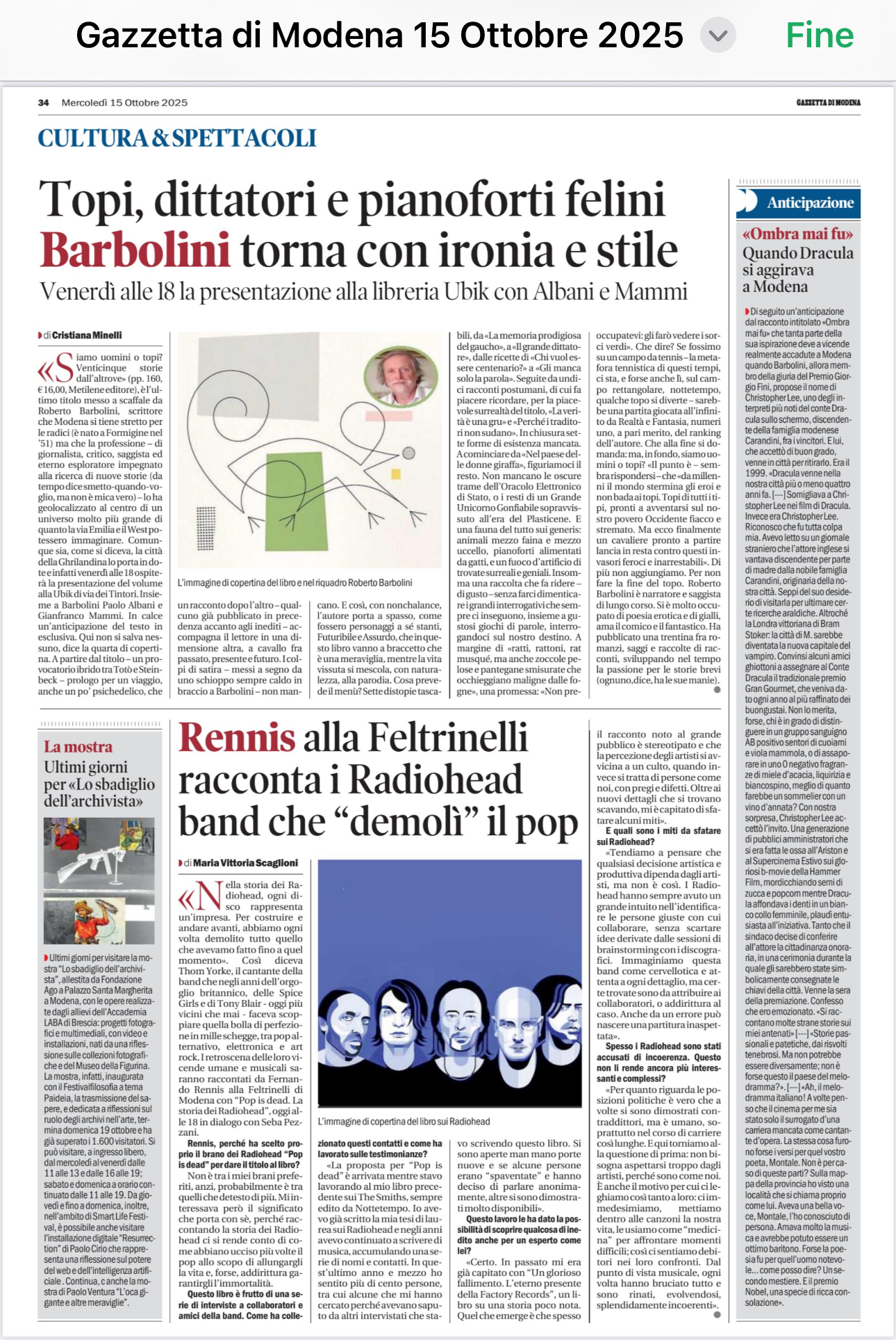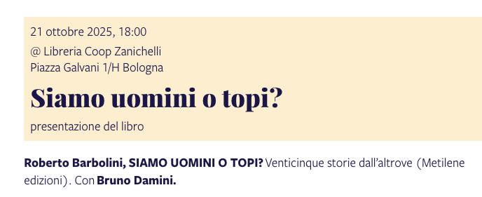 ![]() Roberto Barbolini, Siamo uomini o topi? Venticinque storie dall'altrove, Metilene, Pistoia 2025, pp. 160, € 16,00 ![]() _________________________ Mi piace riportare quello che scrive su Barbolini, detto "il Barbo", Cesare Garboli nella Introduzione a un altro libro dello stesso Barbo La strada fantasma (Bibliotheka 2025). _________________________ Recensioni Cristiana Minelli, Topi, dittatori e pianoforti felini. Barbolini torna con ironia e stile, «Gazzetta di Modena», 15 ottobre 2025, p. 34. ![]() Una recensione di Bruno Damini, giornalista e scrittore, su Cantiere Bologna, postata domenica 26 ottobre 2025. ![]() __________________ Presentazioni ![]() 2025 ![]() ![]() ________________________ Per tornare alla collana "Aritmie" di Metilene cliccate qui. ![]() HOME PAGE TèCHNE RACCONTI POESIA VISIVA |