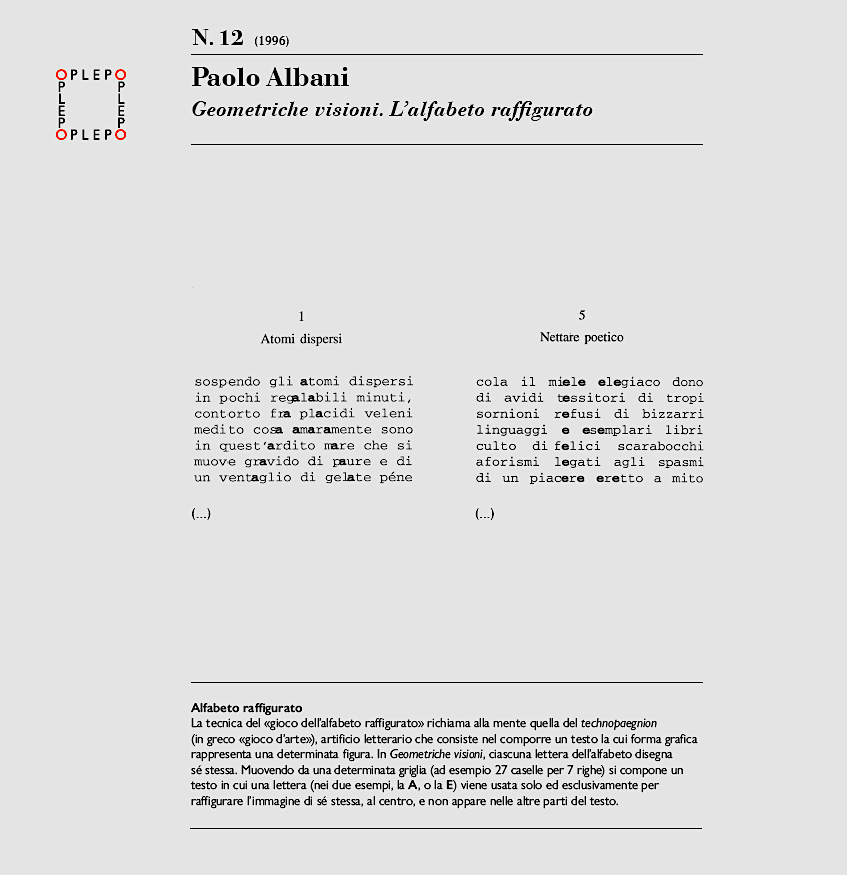 35 ANNI DELL'OPIFICIO DI LETTERATURA POTENZIALE Biblioteca Cantonale di Bellinzona (Svizzera) viale S. Franscini 30a Progetto sostenuto da Cultura in movimento e Fondo Swisslos ![]() curatori della mostra Paola Piffaretti e Joshua Babic 2 ottobre - 13 novembre 2023 Per vedere l'invito alla mostra cliccate qui. Nel 1990, Raffaele Aragona, Ruggero Campagnoli e Domenico D’Oria fondano a Capri l’Opificio di letteratura potenziale (OPLEPO). Esso si ispira all’OULIPO (Ouvroir de littérature potentielle) nato a Parigi nel 1960 e animato da figure come Georges Perec, Raymond Queneau e Italo Calvino. Un’avventura che raggruppa accademici, scrittori, ma anche informatici, matematici, biologi. Membri dell’OPLEPO sono, tra gli altri, Paolo Albani, Camille Bloomfield, Valerio Magrelli, Piergiorgio Odifreddi, Edoardo Sanguineti, Aldo Spinelli. A 35 anni dalla nascita dell’OPLEPO, per la prima volta in Svizzera, una mostra è dedicata a questo eccezionale laboratorio creativo in continuo fermento, dove la scrittura si misura con il gioco, la regola e l’invenzione. __________________________ Eventi collaterali che si svolgono tutti in Biblioteca: venerdì 24 ottobre 2025 alle ore 18:30 Paolo Albani Labirinti di parole. La regola e l'immaginazione nei testi oplepiani interviene Stefano Vassere, direttore delle Biblioteche cantonali sabato 25 ottobre 2025 alle ore 10:00 Joshua Babic e Paola Piffaretti Ri-creazioni. Atelier di scrittura potenziale giovedì 13 novembre 2025 alle ore 18:30 Camille Bloomfield e Valentin Decoppet Un testo, otto mani. Tradurre e trasporre il radiodramma «Die Maschine» di Georges Perec e Eugen Helmlé moderano la serata Joshua Babic e Paola Piffaretti __________________________ Accompagna la mostra un libretto, curato da Joshua Babic e Paola Piffaretti, della collana TicinoLettura Testi 35, che contiene un mio "racconto" inedito. ![]() Il mio testo inedito s'intitola Palingrammi. Omaggio a Georges Perec. __________________ In mostra ci sono alcuni pannelli relativi alle regole inventate dagli oplepiani. Il pannello relativo al mio "alfabeto raffigurato" è questo: ![]()