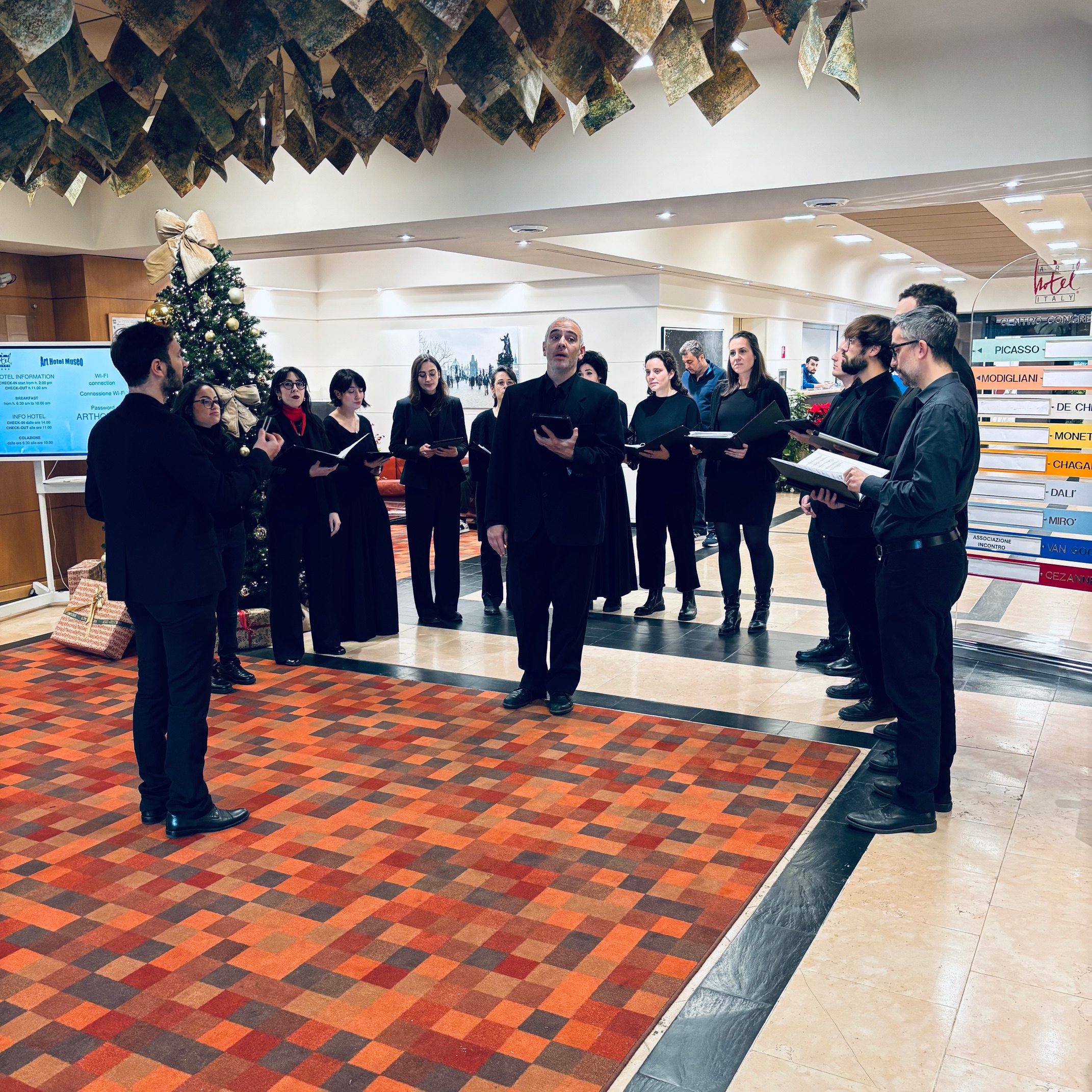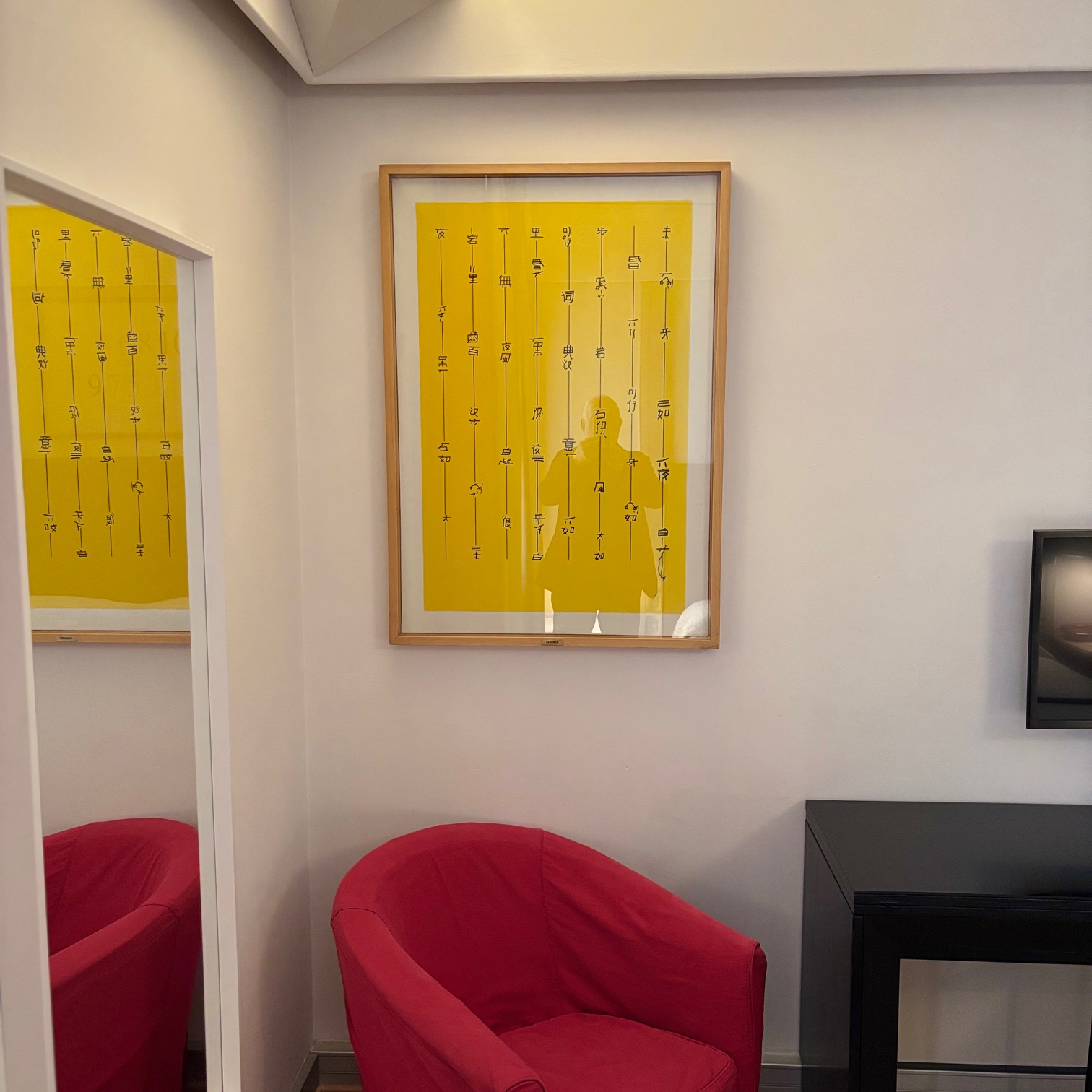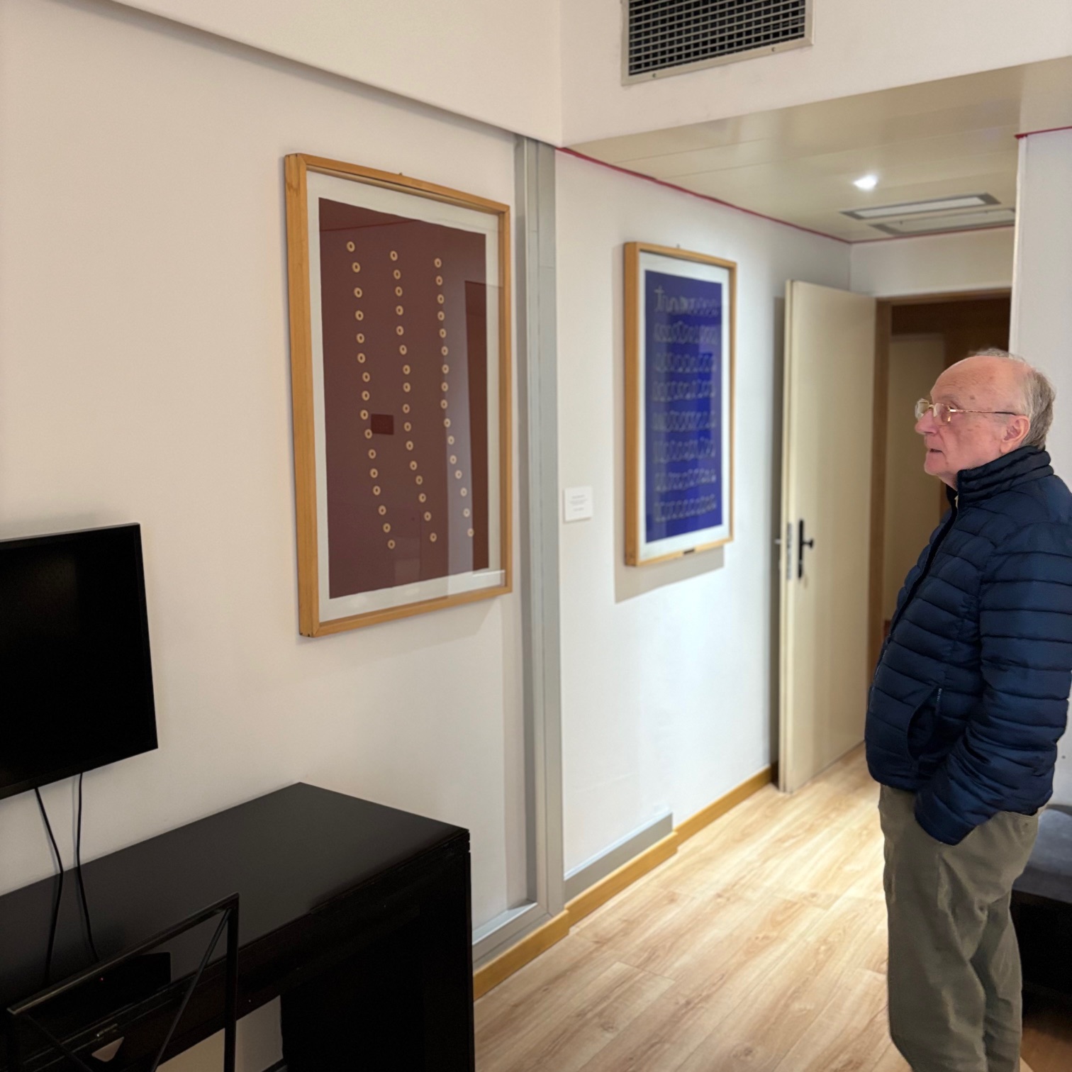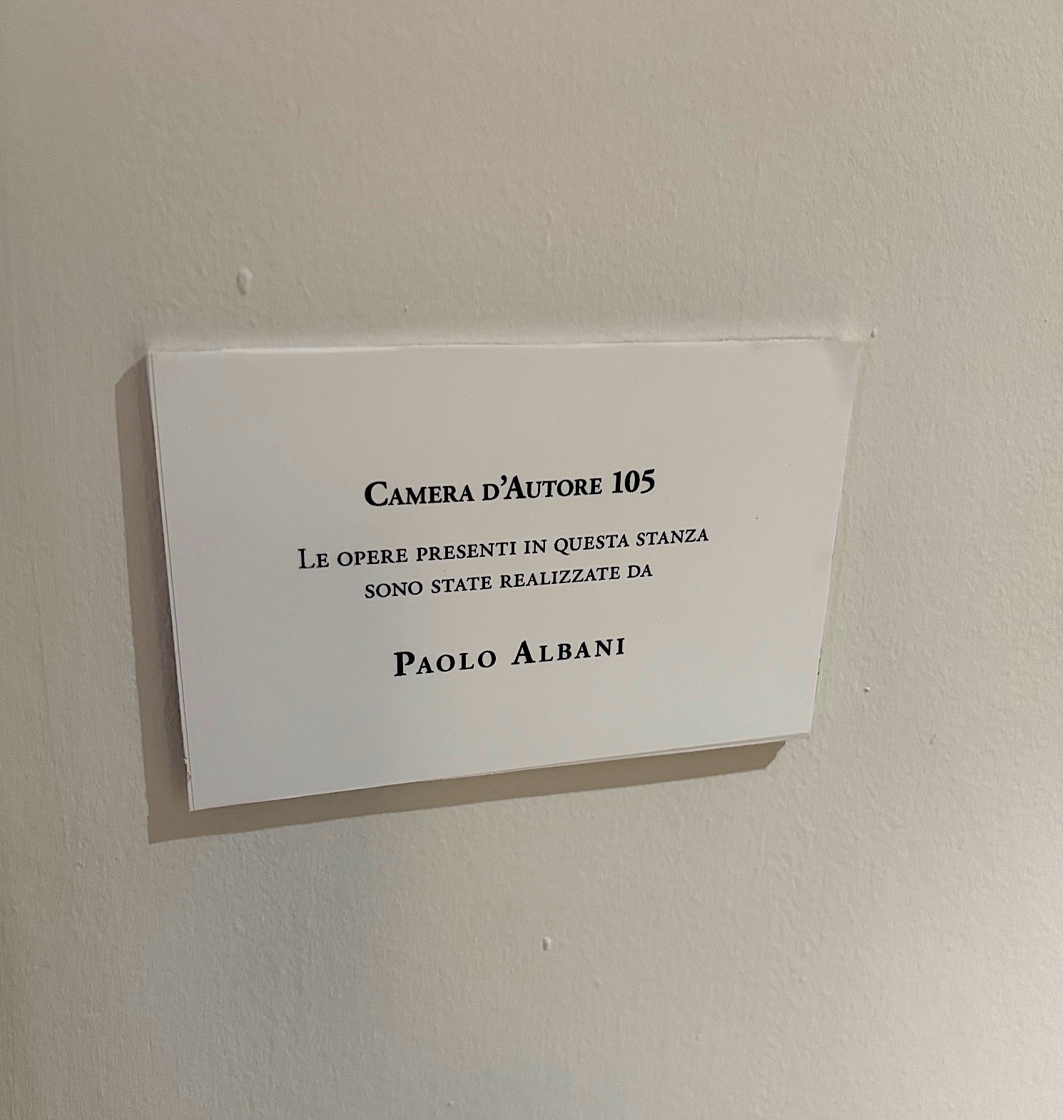 CAMERA D'AUTORE N. 105 Art Hotel Museo Via della Repubblica, n. 289 Prato ![]() ![]() L'Hotel si trova davanti al Centro per l'Arte Contemporanea Luigi Pecci di Prato ![]() ![]() Sabato 6 dicembre 2025, in concomitanza con un pranzo di beneficienza a favore dell'Associazione Giorgio La Pira, vengono inaugurate due Camere d'autore, una dell'artista Patrizia Bogani, nota per la sua arte legata al tessile, e un'altra (n. 105) a me dedicata con mie opere dell'Archivio Carlo Palli. __________________________________________ CAMERA D'AUTORE N. 105 ![]() ![]() ![]() ![]() ![]() _________________________________ DETTAGLI DELLE MIE OPERE ![]() Apparire/Disparire, 2012 pannello con numeri in dissolvenza cm70x100 [in alto, nella prima riga, compaiono solo numeri "pari", che piano piano sono nell'atto di apparire (in modo antiquato si potrebbe dire che appariscono); in basso invece, nella seconda riga, ci sono solo numeri "dispari" che si dissolvono, cioè sono nell'atto di disparire (in modo antiquato si potrebbe dire che dispariscono)] ![]() Calligramma, 1991 materiale farmaceutico, ovvero piccoli cerotti per i calli, su tela cm100x70 [l'opera è un omaggio al calligramma Il pleut di Guillaume Apollinaire (1880-1918): ![]() ![]() Le plot des flots du mot E, 1991 filo di ferro su tela colorata cm100x70 ![]() Filocinèsi, 1991 filo e ago e caratteri cinesi (sinogrammi) su tela colorata cm100x70 ____________________________________ Alcune foto del pranzo di beneficienza all'Art Hotel Museo di Prato ![]() Il collezionista Carlo Palli con Elena Pieralli, presidente dell'Associazione Giorgio La Pira ![]() ![]() L'Euphonios Vocal Ensemble Per ascoltare un brano da loro eseguito sabato 6 dicembre 2025 durante l'inaugurazione dell'evento all'Art Hotel Museo, cliccate qui. |