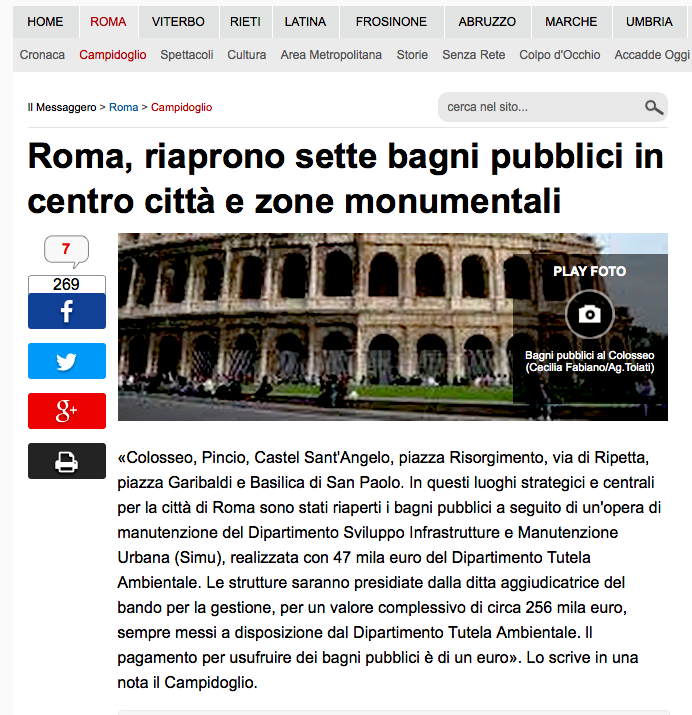 Bagno Pubblico del Colosseo RIAPERTURA DEL BAGNO PUBBLICO DEL COLOSSEO 22 febbraio 2018 Per la riapertura di sette bagni pubblici a Roma, nel bagno pubblico del Colosseo è stata posizionata una mia opera, Caduta di gusto (1992), nell'ambito di un'iniziativa che tende a costituire una galleria d'arte diffusa (GAD). Per vedere un video (29'') sull'evento cliccate qui. ![]() La notizia su "il Messaggero" on line del 22 febbraio 2018 ![]() Un passaggio del comunicato del Campidoglio Il 24 febbraio 2018 su ArtTribune, piattaforma di contenuti e servizi dedicata all'arte e alla cultura contemporanea, esce un commento abbastanza critico e sarcastico sull'intera operazione "cesso del Colosseo", I sette cessi di Roma. Riparare una toilette, appenderci un quadro e farne un'impresa epica, a firma della critica d'arte e giornalista Helga Marsala, per leggere cosa dice della mia opera in particolare cliccate qui. L'entrata del bagno pubblico del Colosseo ![]() Prima che l'opera sia svelata Con Vitaliano Biondi, architetto responsabile dei parchi capitolini Caduta di gusto, 1992 lettere di ottone su cartoncino nero, cm 43x53 _____________________________________ Per tornare al menu delle mie collaborazioni con artisti, gruppi teatrali, designer, istituzioni pubbliche e private, università, ecc., cliccate qui. HOME PAGE TèCHNE RACCONTI POESIA VISIVA |