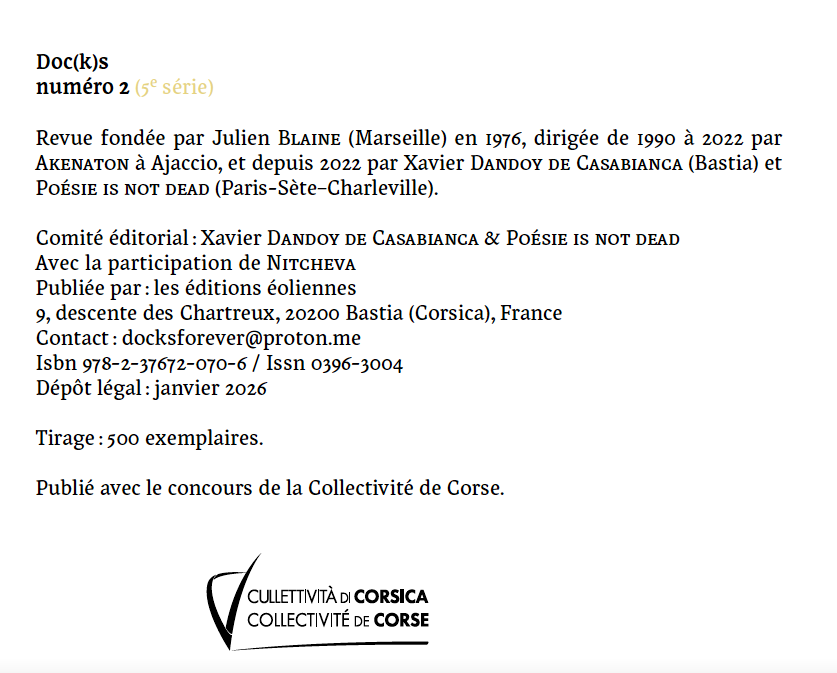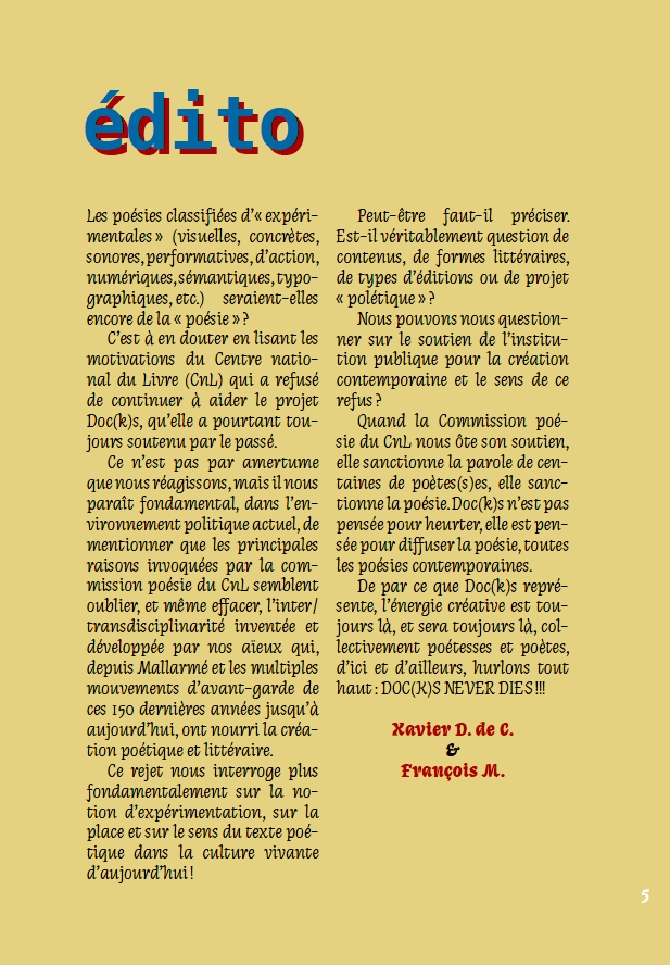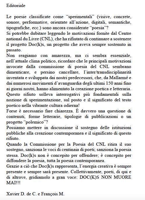 Rivista internazionale fondata nel 1976 da Julien Blaine n. #2, 5° série 2026 ![]() ![]() Comitato Editoriale di Doc(k)s ![]() Editoriale del #2, 2026 ![]() un numero palindromo) c'è una mia poesia visiva intitolata P / oesia del 1989, un cartello stradale modificato, alto 208 cm: ![]() ______________________________________________ n. 71, estate 1985 ![]() Da sinistra: Sarenco, Nanni Balestrini e Adriano Spatola.