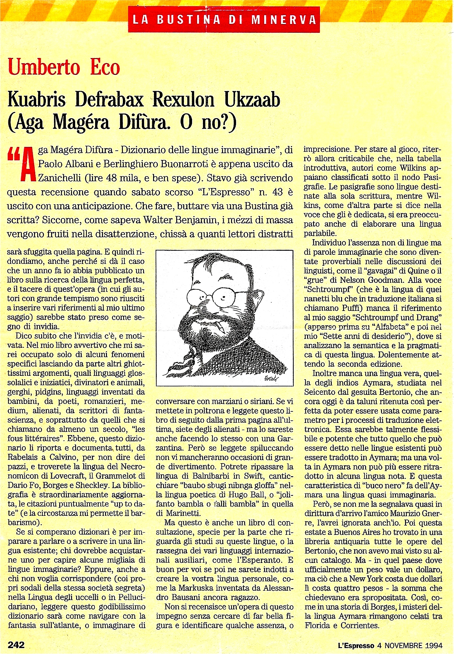 KUABRIS DEFRABAX REXULON UKZAAB (*) (Aga Magéra Difúra. O no?) ![]() "Aga Magéra Difúra - Dizionario delle lingue immaginarie", di Paolo Albani e Berlinghiero Buonarroti è appena uscito da Zanichelli (lire 48.000 mila, e ben spese). Stavo già scrivendo questa recensione quando sabato scorso L'Espresso n. 43 è uscito con una anticipazione. Che fare, buttare via una Bustina già scritta? Siccome, come sapeva Walter Benjamin, i mezzi di massa vengono fruiti nella disattenzione, chissà a quanti lettori distratti sarà sfuggita quella pagina. E quindi ridondiamo, anche perché si dà il caso che un anno fa io abbia pubblicato un libro sulla ricerca della lingua perfetta, e il tacere di quest'opera (in cui gli autori con grande tempismo sono riusciti a inserire vari riferimenti al mio ultimo saggio) sarebbe stato preso come segno di invidia. Dico subito che l'invidia c'è, e motivata. Nel mio libro avvertivo che mi sarei occupato solo di alcuni fenomeni specifici lasciando da parte altri ghiottissimi argomenti, quali linguaggi glossolalici e iniziatici, divinatori e animali, gerghi, pidgins, linguaggi inventati da bambini, da poeti, romanzieri, medium, alienati, da scrittori di fantascienza, e soprattutto da quelli che si chiamano da almeno un secolo, "les fous littéraires". Ebbene, questo dizionario li riporta e documenta tutti, da Rabelais a Calvino, per non dire dei pazzi, e troverete la lingua del Necronomicon di Lovecraft, il Grammelot di Dario Fo, Borges e Sheckley. La bibliografia è straordinariamente aggiornata, le citazioni puntualmente "up to date" (e la circostanza mi permette il barbarismo). Se si comperano dizionari è per imparare a parlare o a scrivere in una lingua esistente; chi dovrebbe acquistarne uno per capire alcune migliaia di lingue immaginarie? Eppure, anche a chi non voglia corrispondere (coi propri sodali della stessa società segreta) nella Lingua degli uccelli o in Pellucidariano, leggere questo godibilissimo dizionario sarà come navigare con la fantasia sull'atlante, o immaginare di conversare con marziani o siriani. Se vi mettete in poltrona e leggete questo libro di seguito dalla prima pagina all'ultima, siete degli alienati - ma lo sareste anche facendo lo stesso con una Garzantina. Però se leggete spiluccando non vi mancheranno occasioni di grande divertimento. Potrete ripassare la lingua di Balnibarbi in Swift, canticchiare "baubo sbugi nibnga gloffa" nella lingua poetica di Hugo Ball, o "jolifanto bambla o falli bambla" in quella di Marinetti. Ma questo è anche un libro di consultazione, specie per la parte che riguarda gli studi su queste lingue, o la rassegna dei vari linguaggi internazionali ausiliari, come l'Esperanto. E buon per voi se poi ne sarete indotti a creare la vostra lingua personale, come la Markuska inventata da Alessandro Bausani ancora ragazzo. Non si recensisce un'opera di questo impegno senza cercare di far bella figura e identificare qualche assenza, o imprecisione. Per stare al gioco, riterrò allora criticabile che, nella tabella introduttiva, autori come Wilkins appaiano classificati sotto il nodo Pasigrafie. Le pasigrafie sono lingue destinate alla sola scrittura, mentre Wilkins, come d'altra parte si dice nella voce che gli è dedicata, si era preoccupato anche di elaborare una lingua parlabile. Individuo l'assenza non di lingue ma di parole immaginarie che sono diventate proverbiali nelle discussioni dei linguisti, come il "gavagai" di Quine o il "grue" di Nelson Goodman. Alla voce "Schtroumpf" (che è la lingua di quei nanetti blu che in traduzione italiana si chiamano Puffi) manca il riferimento al mio saggio "Schtroumpf und Drang" (apparso prima su Alfabeta e poi nel mio Sette anni di desiderio), dove si analizzano la semantica e la pragmatica di questa lingua. Dolentemente attendo la seconda edizione. Inoltre manca una lingua vera, quella degli indios Aymara, studiata nel Seicento dal gesuita Bertonio, che ancora oggi è da taluni ritenuta così perfetta da poter essere usata come parametro per i processi di traduzione elettronica. Essa sarebbe talmente flessibile e potente che tutto quello che può essere detto nelle lingue esistenti può essere tradotto in Aymara; ma una volta in Aymara non può più essere ritradotto in alcuna lingua nota. E questa caratteristica di "buco nero" fa dell'Aymara una lingua quasi immaginaria. Però, se non me la segnalava quasi in dirittura d'arrivo l'amico Maurizio Gnerre, l'avrei ignorata anch'io. Poi questa estate a Buenos Aires ho trovato in una libreria antiquaria tutte le opere del Bertonio, che non avevo mai visto su alcun catalogo. Ma - in quel paese dove ufficialmente un peso vale un dollaro, ma ciò che a New York costa due dollari lì costa quattro pesos - la somma che chiedevano era spropositata. Così, come in una storia di Borges, i misteri della lingua Aymara rimangono celati tra Florida e Corrientes.