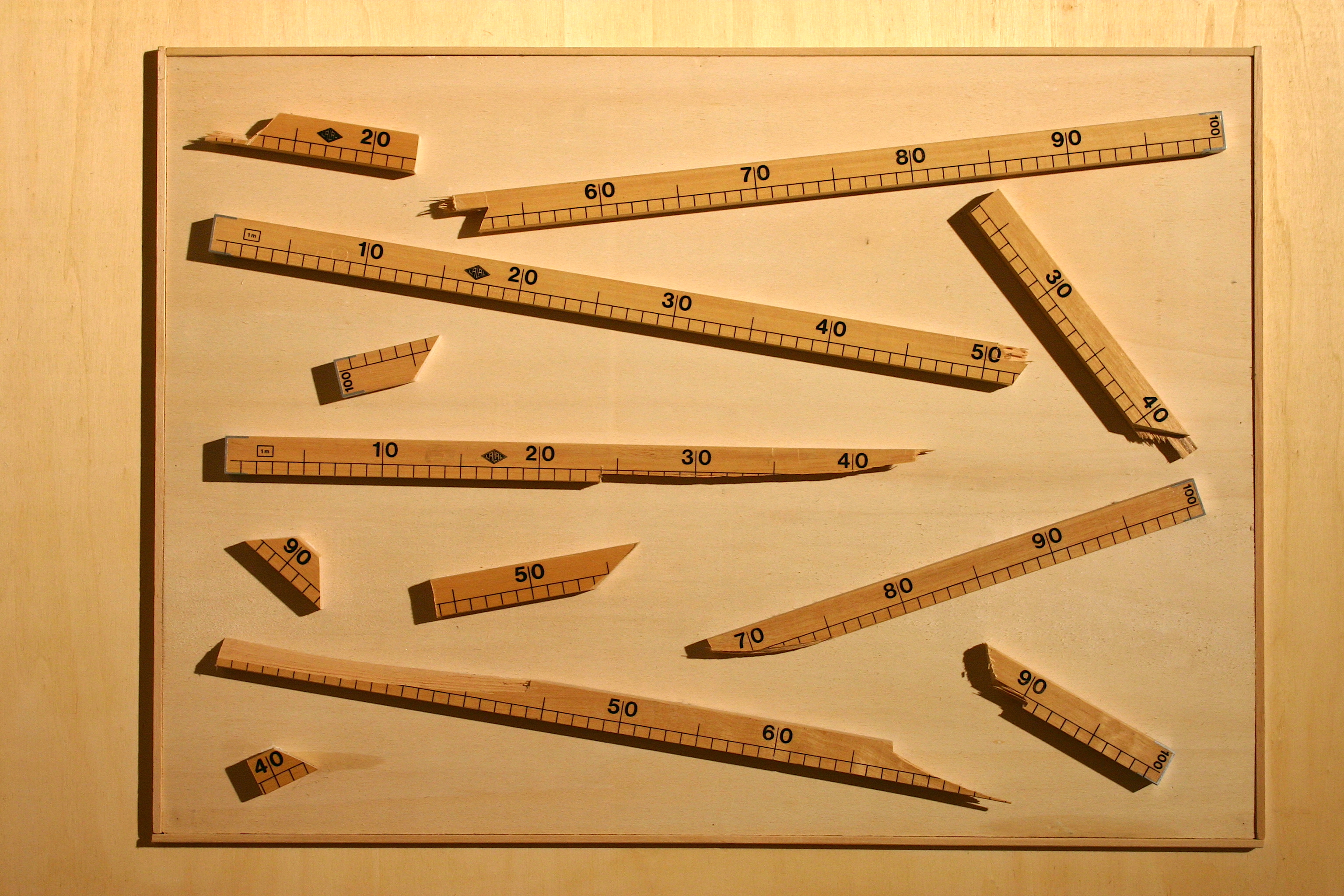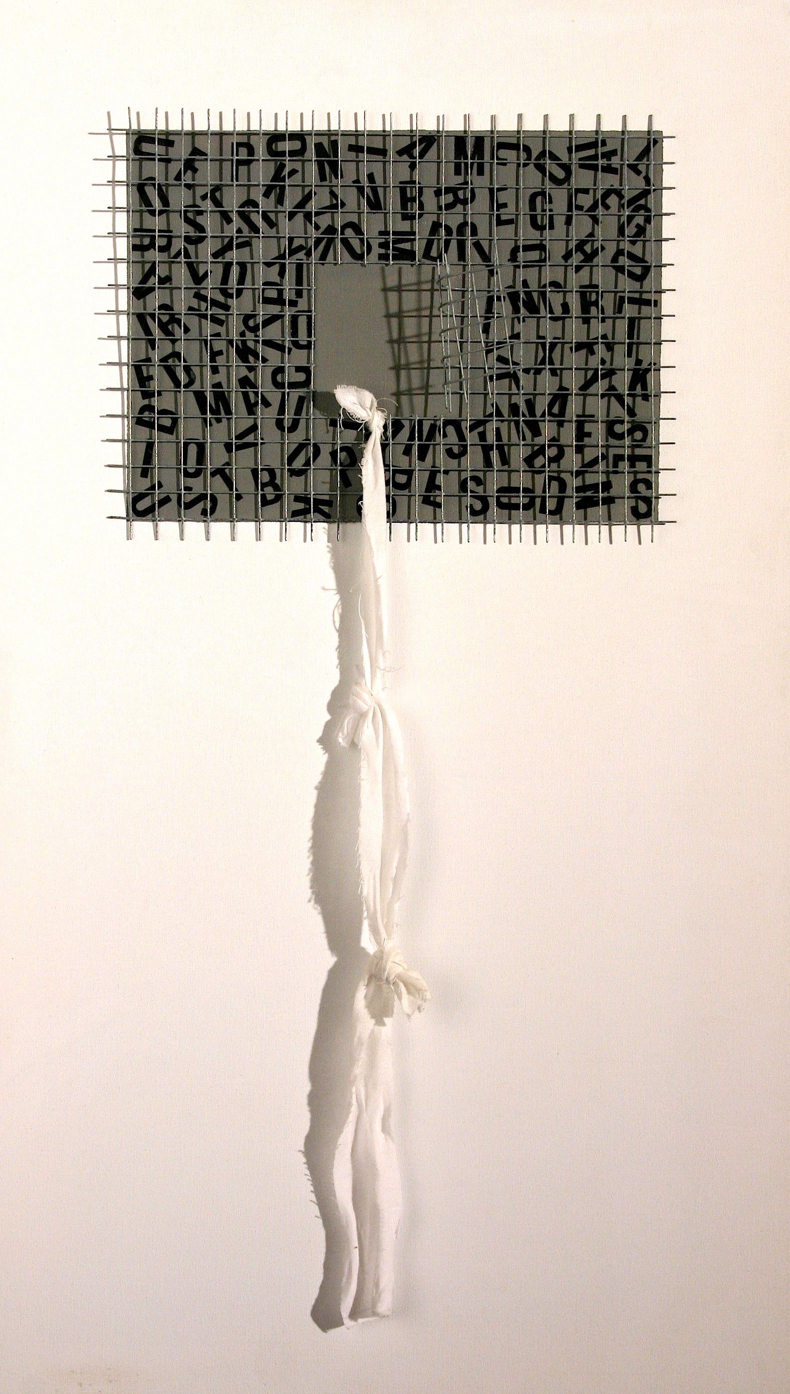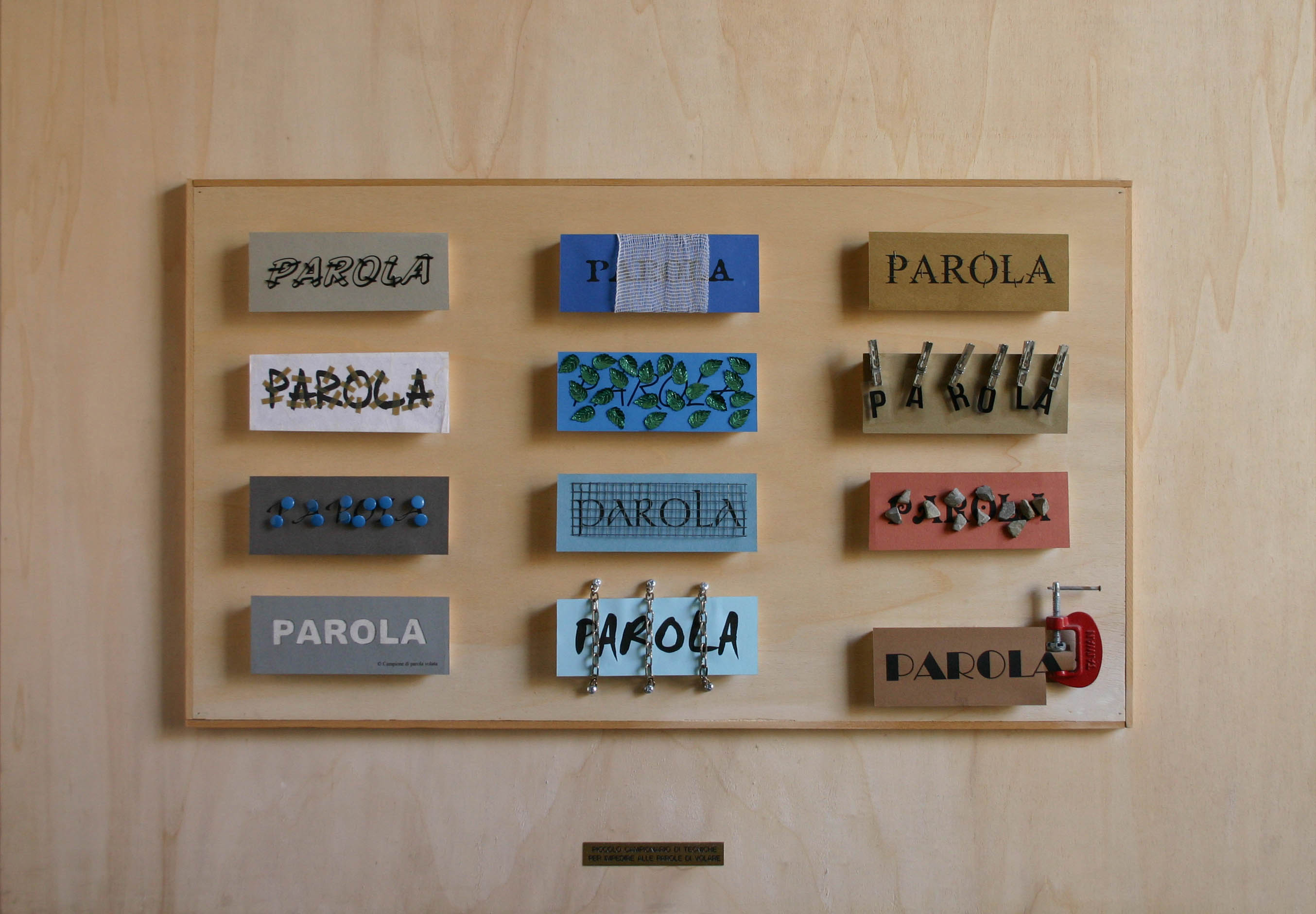 ![]() Piccolo campionario di tecniche per impedire il volo alle parole, 2003 materiali vari su tavoletta di legno, cm 70x100