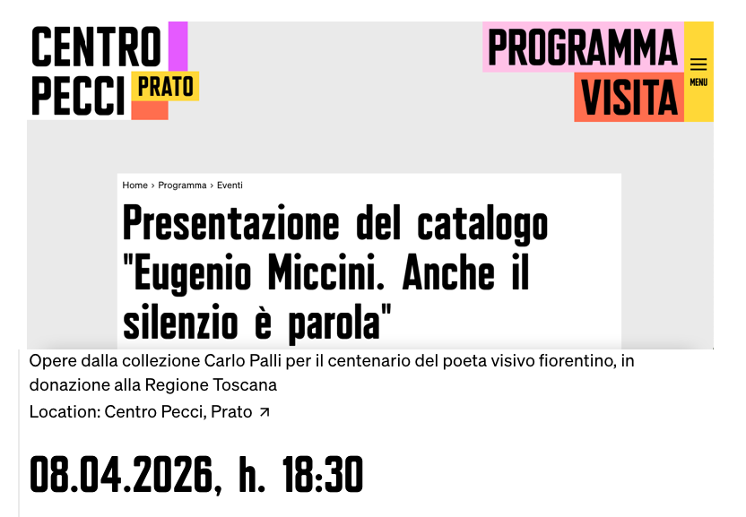 ULTIMI AGGIORNAMENTI ANNO 2026 ![]() mercoledì 8 aprile Il Moma, The Museum of Modern Art, di New York, ospita dal 12 aprile al 22 agosto 2026 la mostra Marcel Duchamp, tutti i giorni; biglietto: $ 30, circa € 25. Con trecento opere, è la prima retrospettiva negli Usa dal 1973 dedicata all'artista francese naturalizzato statunitense (1887-1968). ![]() *** lunedì 6 aprile Ieri sulla «Domenica de Il Sole 24 ore» una mia recensione, Tutti quelli capaci di scrivere versi d'eros e seduzione, al libro curato da Guido Almansi e Roberto Barbolini, La passion predominante (Bibliotheka). Fra gli scrittori antologizzati - non ci crederete - anche l'autore di Cuore. ![]() Edmondo De Amicis (1846-1908) Mercoledì 8 aprile alle 18:30 al Centro per l'arte contemporanea Luigi Pecci di Prato sarà presentato il catalogo, edito da Polistampa (Firenze), della mostra Eugenio Miccini. Anche il silenzio è parola, opere dalla collezione Carlo Palli per il centenario del poeta visivo fiorentino, in donazione alla Regione Toscana, Palazzo Strozzi Sacrati (Piazza Duomo, n. 10), Firenze, dal 2 febbraio al 28 marzo 2026. Per il catalogo ho scritto Un ricordo di Miccini alla maniera di Perec. ![]() *** |