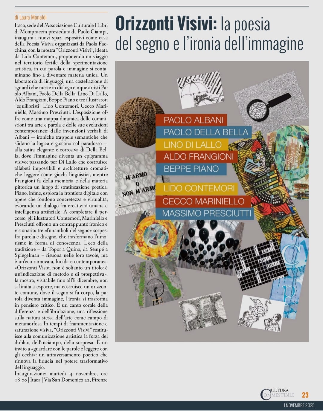 mostra da un'idea di Lido Contemori ITACA sede dell’Associazione Culturale I Libri di Mompracem presieduta da Paolo Ciampi e dello spazio espositivo la Casa della Poesia visiva organizzato da Paola Facchina, Via San Domenico 22, Firenze 4 novembre - 8 dicembre 2025 Catalogo con un testo critico di Laura Monaldi ![]() Comunicato stampa __________________________________ Artisti presenti: Paolo Albani, Paolo della Bella, Lino Di Lallo, Aldo Frangioni, Beppe Piano, con le illustrazioni di Lido Contemori, Cecco Mariniello e Massimo Presciutti. ________________________________ RECENSIONI ![]() «Cultura Commestibile» 594, 1 novembre 2025, p. 23 ___________________________________________ Le mie opere in mostra: ![]() Crucciverba, 2021 riproduzione di schema di parole crociate, cm 65,2x74,3 ![]() Dubbio lapidario, 2011 pannello ricoperto di carta marmorizzata e lettere d'ottore, cm 60x70 ![]() Il quadro della situazione, 2012 pannello con disegno e scritta, cm 70x100 ![]() Stato d'animo, 2008 carta geografica modificata, cm 80x100 HOME PAGE TèCHNE RACCONTI POESIA VISIVA |