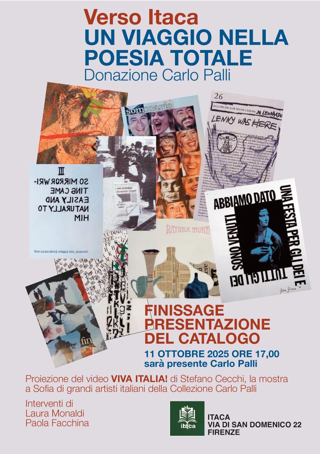 NELLA POESIA TOTALE. DONAZIONE CARLO PALLI presso Itaca, la casa della cultura, della creatività e della convivialità, attiva a Firenze, via di San Domenico, n. 22. ![]() ![]() ________________________ La mia opera in mostra: ![]() Assolo, 1988 cm 43 x 53, letterine adesive su cartoncino ![]() ________________________ ![]() Un'immagine dell'inaugurazione a Itaca, giovedì 24 luglio ore 18:30, sulla sinistra s'intravede il collezionista Carlo Palli. ![]() Con il microfono in mano Carlo Palli ![]() _________________________________ Sabato 11 ottobre 2025 finissage della mostra, con presentazione catalogo e proizione del video VIVA ITALIA! di Stefano Cecchi sulla mostra a Sofia della Collezione Carlo Palli. ![]() HOME PAGE TèCHNE RACCONTI POESIA VISIVA |