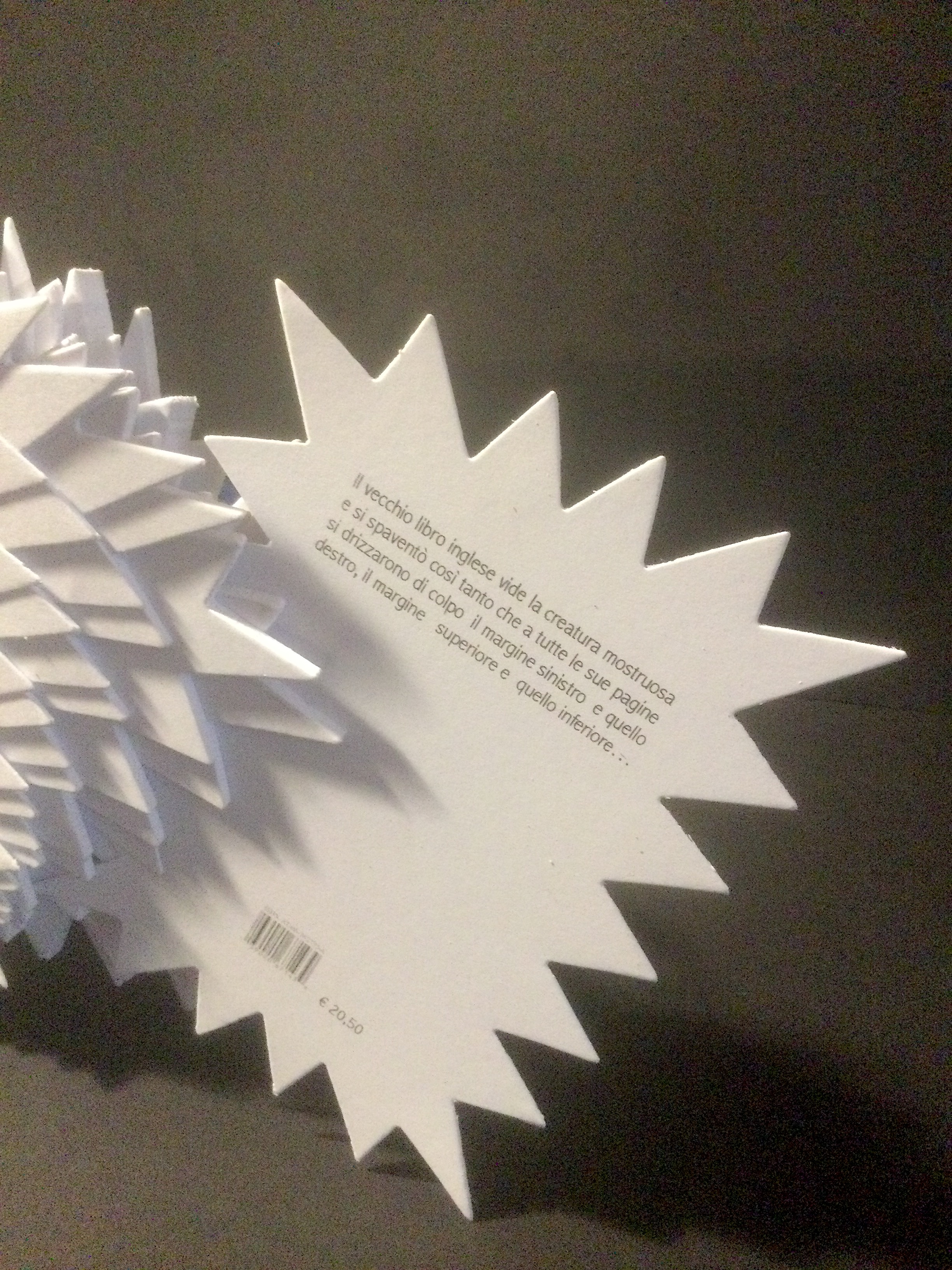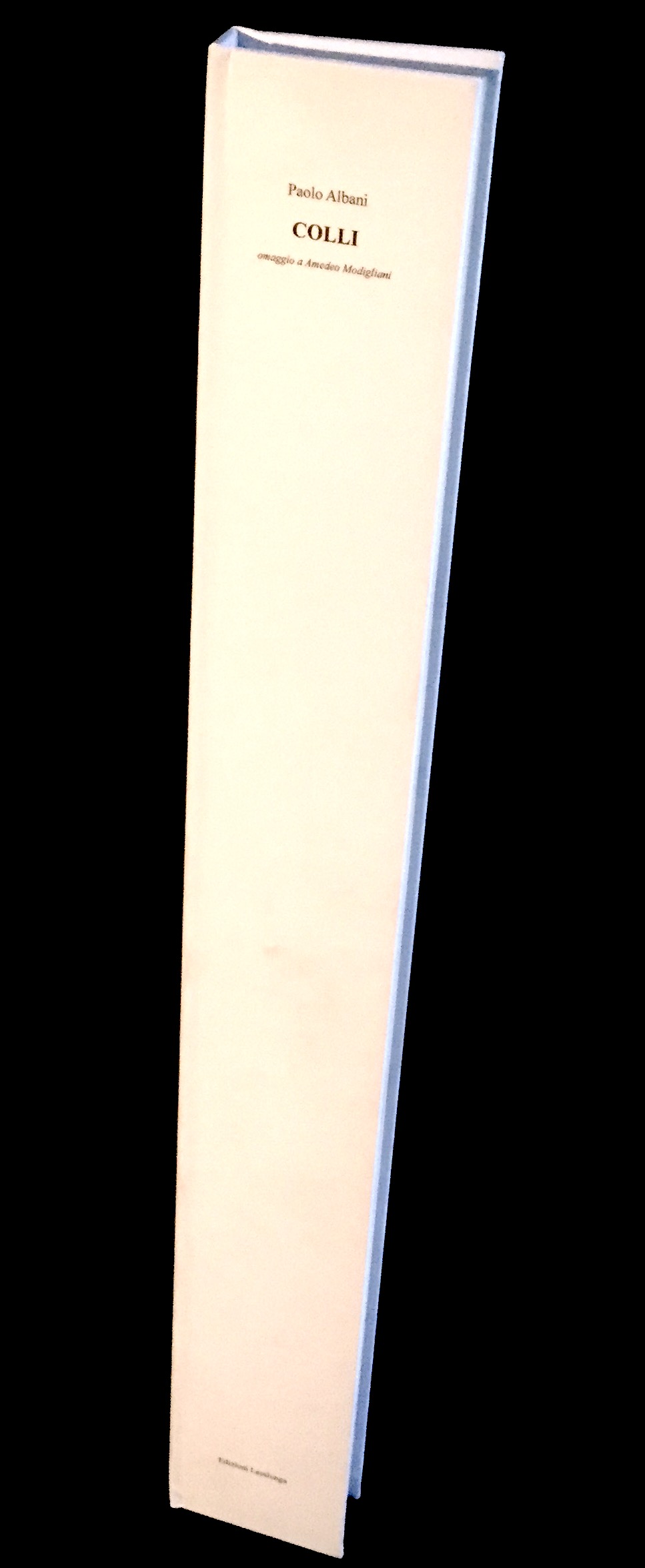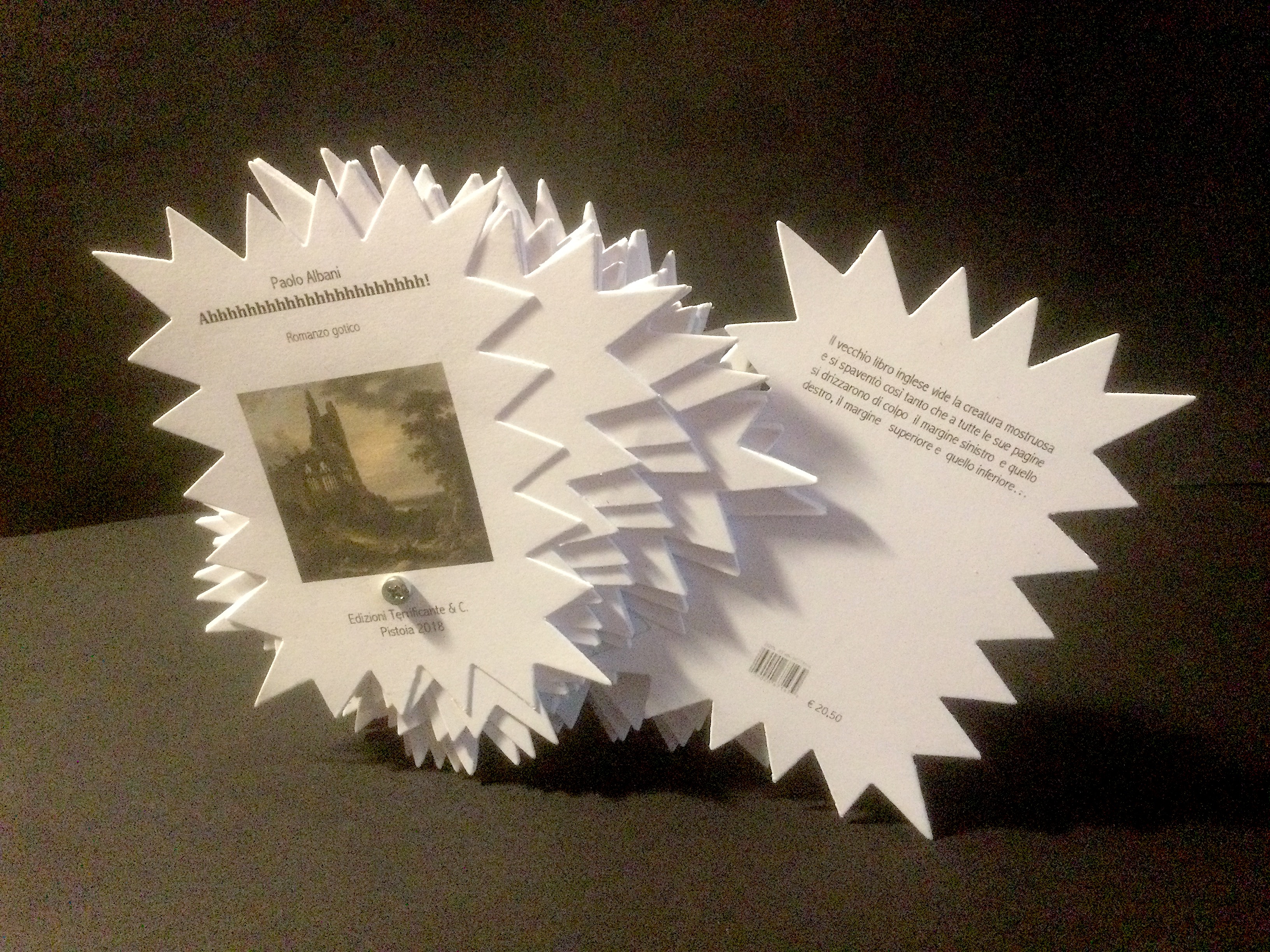E PATA-ARCHIVI a cura di Duccio Scheggi, con gli interventi di Anna Busetto Vicari e Afro Somenzari Biblioteca San Giorgio Pistoia dal 9 gennaio al 7 febbraio 2026 Per leggere un testo introduttivo di Duccio Scheggi alla mostra cliccate qui. ________________________ In mostra ci sono tre miei libri d'artista: Paolo Albani, Ahhhhhhhhhhhhhhhhhhhhhh! Romanzo gotico, 2018-2026 fogli con punte sui bordi e testo cm 14x10,5x3 Esemplare unico Il testo nella "quarta di copertina" dice: Il vecchio libro inglese vide la creatura mostruosa e si spaventò così tanto che a tutte le sue pagine si drizzarono di colpo il margine sinistro e quello destro, il margine superiore e quello inferiore... Paolo Albani, Colli. Omaggio a Amedeo Modigliani, 2016 libro lungo rilegato cm. 66x8,7x2,2 Paolo Albani, Libro noir con appendi-alibi, 2017 struttura in plexiglass, fogli neri con scritte bianche e grucce di plastica cm. 30x44x28 ![]() ![]() ![]() HOME PAGE TèCHNE RACCONTI POESIA VISIVA |